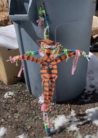 Sculpture using found sticks, bottle caps, and fabric scraps